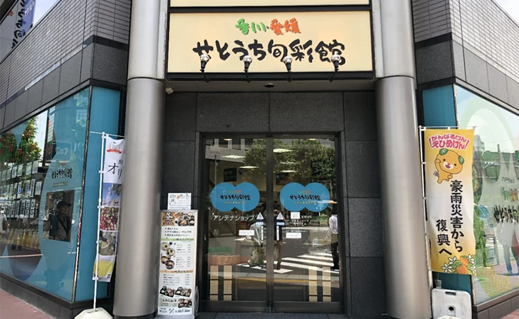 JR「新橋駅」の目の前に位置する「香川・愛媛せとうち旬彩館」。香川県と愛媛県が共同で運営するアンテナショップです。アクセスも良く、平日は主婦層や近隣のオフィスワーカーを中心に、週末はご家族連れや観光客の方々で賑わっています。「特産品ショップ」では、愛媛のじゃこ天やタルト、柑橘製品など両県の人気特産品がいっぱい。